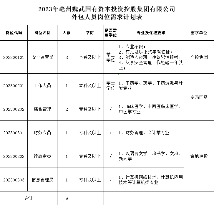 因工作需要,現(xiàn)委托亳州市譙騰人力資源管理有限公司面向社會(huì)招聘外包崗位人員9名;現(xiàn)將有關(guān)招聘事宜公告如下: