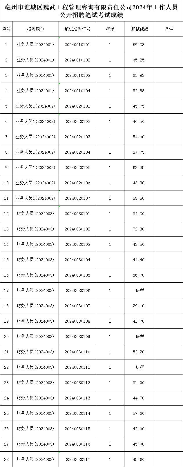 關(guān)于亳州市譙城區(qū)魏武工程管理咨詢有限責(zé)任公司2024年工作人員公開招聘筆試考試成績(jī)公示