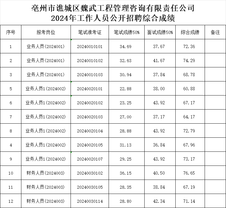關(guān)于亳州市譙城區(qū)魏武工程管理咨詢有限責任公司2024年工作人員公開招聘面試成績及綜合成績的公示